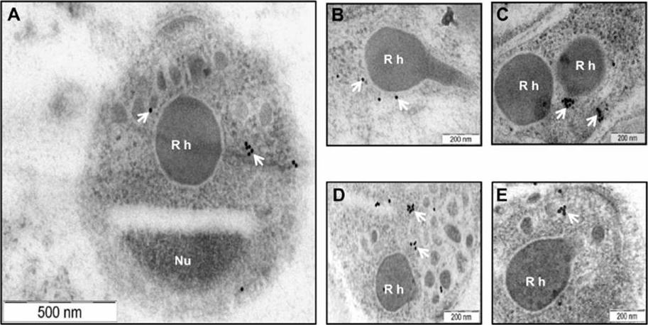 Localization of PfMA by Immuno-electron microscopy. Ultra thin sections of P. falciparum parasites at schizont/merozoite stages were labelled with mouse anti-PfMA or anti-EBA-175 antibodies followed with anti-mouse secondary antibody conjugated with 15nm colloidal gold particle. (A) Labelling with the PfMA antibody was confined only to the micronemes (arrows) in the apical end of the free merozoite and was absent from the rhoptry (Rh) or nucleus (Nu). (B, C) Similarly PfMA staining in the schizonts was observed only in the micronemes and not in the rhoptries. (D, E) A similar pattern of staining in the schizonts was observed with the micronemal marker EBA-175.Hans N, Singh S, Pandey AK, Reddy KS, Gaur D, Chauhan VS. Identification and Characterization of a Novel Plasmodium falciparum Adhesin Involved in Erythrocyte Invasion. PLoS One. 2013 Sep 13;8(9):e74790.