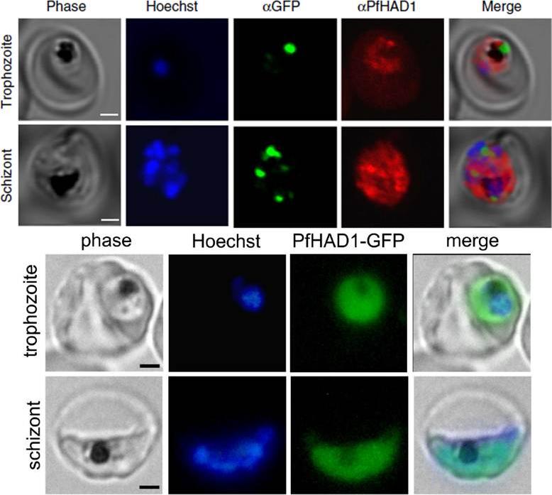 PfHAD1 is expressed in blood-stage parasites and is localized to the parasite cytoplasm. Immunofluorescence confocal microscopy of ACPLGFP trophozoite and schizont, stained with aGFP and aPfHAD1 antibodies and Hoechst 33258 nuclear stain. Scale bars, 2 mm. Lower panel: PfHAD1-GFP localization is similar to that of PfHAD1 (Upper panel). Shown is live microscopy of AM1 Hsp110:PfHAD1-GFP trophozoite and schizont, stained with Hoechst 33258 nuclear stain. Scale bars represent 2 μm.Guggisberg AM, Park J, Edwards RL, Kelly ML, Hodge DM, Tolia NH, Odom AR. A sugar phosphatase regulates the methylerythritol phosphate (MEP) pathway in malaria parasites. Nat Commun. 2014 24;5:4467.