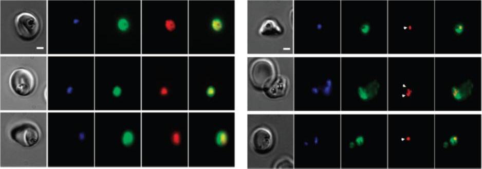 PfHsp110c prevents the aggregation of Asn-rich protein during febrile episodes. Live fluorescence images of PfHsp110c–RFA parasite lines expressing (a,b) the Asn repeat-rich parasite protein, PFI1155w. incubated at 400C for 6 h with (a) or without (b) 10mM TMP. The arrowheads indicate fluorescent foci of PFI1155w–tagRFP-T (b). Scale bar represents 2 mm. Images from left to right are phase, DAPI, GFP (MAL13P1.540), RFP (PFI1155w) and GFP–RFP merge. Parasites that were subjected to heat shock without TMP showed foci of PFI1155w–tagRFP-T (b) and indicative of protein. The distribution of PfHsp110c–RFA also was more focal upon heat shock in the absence of TMP (b) in the absence of TMP is specifically owing to the loss of PfHsp110c function.Muralidharan V, Oksman A, Pal P, Lindquist S, Goldberg DE. Plasmodium falciparum heat shock protein 110 stabilizes the asparagine repeat-rich parasite proteome during malarial fevers. Nat Commun. 2012 Dec 18;3:1310.