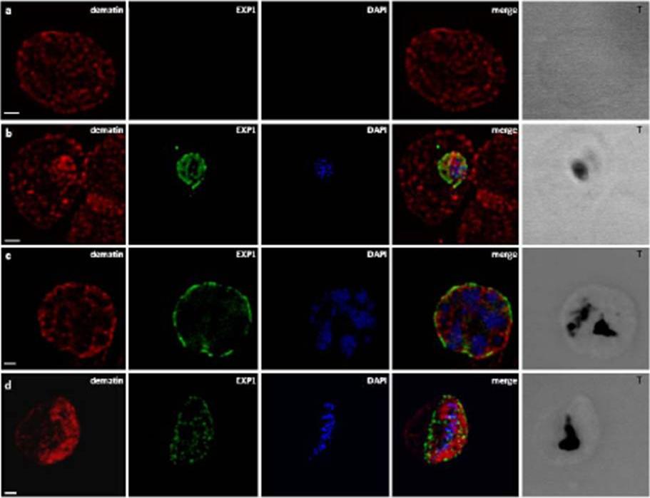 Localization of dematin in P. falciparum iRBC. B) CLSM observations of normal human RBCs (a) and erythrocytes infected by P. falciparum at different developmental stages: trophozoite (b), schizont (c), gametocyte (d), stained with the a-EXP1 serum (green), which decorate the PVM, and a-dematin md52k serum (red). Dematin is an RBC membrane associated protein. Nuclei were stained with DAPI (blue). Displayed micrographs correspond to a single stack encompassing the center of the nucleus. T, transmission light acquisition. Scale bars, 1 mm. Lalle M, Curra C, Ciccarone F, Pace T, Cecchetti S, Fantozzi L, Ay B, Braun Breton C, Ponzi M. Dematin, a component of the erythrocyte membrane-skeleton, is internalized by the malaria parasite and associates with Plasmodium 14-3-3. J Biol Chem. 2010. 286:1227-36