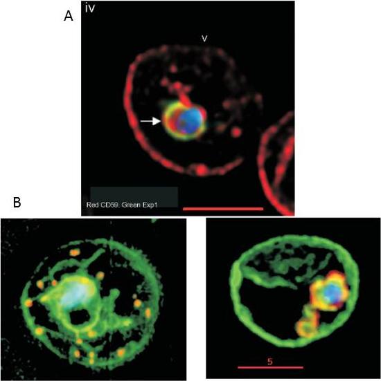 Internalization of host DRM proteins in infected erythrocytes. Infected red cells were probed with primary and relevant secondary antibodies. PfEXP1, green CD59, red. Nucleus (blue) is stained with Hoechst, v indicates the periphery of the red cell, arrows indicate vacuolar parasite, and the scale bar is 5 µm.Lauer S, VanWye J, Harrison T, McManus H, Samuel BU, Hiller NL, Mohandas N, Haldar K. Vacuolar uptake of host components, and a role for cholesterol and sphingomyelin in malarial infection. EMBO J. 2000 19:3556-64. '
