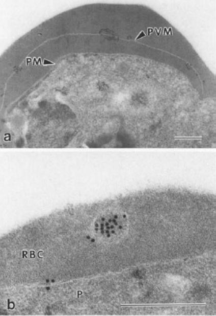 Immunoelectron micrograph showing localisation of parasitophorous vacuole membrane (PVM)-associated antigen, QFll6. Prior to embedding in LR White resin, parasitised erythrocytes were fixed with 0.05% glutaraldehyde (colloidal gold 15 nm). a Labelling is clearly associated with the pvm, which is distinct from the parasitic plasma membrane, b Antigen QF116 is also evident, clustered in vesicles within the erythrocytic cytoplasm. P, parasite; PM, parasitic membrane; P VM, parasitophorous vacuole membrane; RBC, erythrocytic cytoplasm. Bar=0.5 mmIngram LT, Stenzel DJ, Kara UA, Bushell GR. Localisation of internal antigens of Plasmodium falciparum using monoclonal antibodies and colloidal gold. Parasitol Res. 1988;74:208-15.