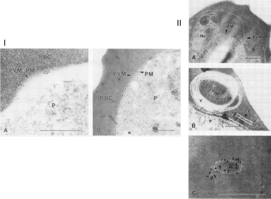 I. Immunoelectron micropgraph of P. falciparum-infected erythrocytes (FCQ-7 strain) labeled with MAb 8E7/55 and colloidal gold IgG complex. A. Schizont-infected erythrocyte showing a distinct separation of PVM from PM, with antibody labeling restricted to the vacuole membrane. Abbreviations: R, rhoptry; Nu, nucleus. (B) Membrane-bound cleft and multimembranous vesicle (V) showing antibody labeling. The parasite (P) is also shown. (C) Dense antibody labeling associated with a membrane-bound vesicle free of electron-dense material. Bars, 0.5 mm.II. Immunoelectron micropgraph of P. falciparum-infected erythrocytes (FCQ-7 strain) labeled with MAb 8E7/55 and colloidal gold IgG complex. A. Ring-stage parasite surface labeled with gold particles (diameter, 15 nm). (B) Trophozoite-stage arasite labeled with gold particles (diameter, 10 nm). Bars, 0.5 mm. Erythrocyte (RBC) and parasite (P) are separated by both the PVM and the PM.Kara UA, Stenzel DJ, Ingram LT, Bushell GR, Lopez JA, Kidson C. Inhibitory monoclonal antibody against a (myristylated) small-molecular-weight antigen from Plasmodium falciparum associated with the parasitophorous vacuole membrane. Infect Immun. 1988 Apr;56:903-9.