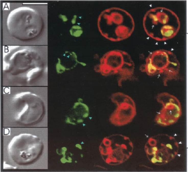 A. Internalization of host detergent-resistant membrane proteins in infected erythrocytes. Infected erythrocytes were probed with primary and relevant secondary antibodies to detect the indicated markers. CD59 (host cell marker), red; EXP1, green; . anti-CD59 antibody was directly conjugated to fluorescein isothiocyanate. The nucleus (blue) is stained with Hoechst, v indicates the periphery of the erythrocyte, arrows indicate vacuolar parasite, asterisks indicate tubular and vesicular membrane, and the scale bar is 5 mm.B. Maurer’s clefts and intraerythrocytic loops are protein domains of the tubovesicular network. (Left) Infected cells labelled with BODIPY-ceramide (green) and probed with antibody Maurer’s cleft protein (red). Blue: parasite nucleus (Hoechst). (Right) Infected cells labelled with BODIPY-ceramide and probed with antibody to PfExp1 that detects intraerythrocytic loops (red). Blue: parasite nucleus (Hoechst).Haldar K, Samuel BU, Mohandas N, Harrison T, Hiller NL. Transport mechanisms in Plasmodium-infected erythrocytes: lipid rafts and a tubovesicular network. Int J Parasitol. 2001 31:1393-401. Copyright Elsevier