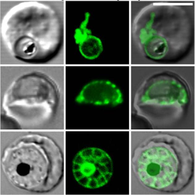 Confocal fluorescence microscopy images of transfected 3D7 P. falciparum-infected RBCs expressing a GFP chimera of a fragment of Exp-1 that is directed to the parasitophorous vacuole. DIC image, the GFP fluorescence signal and an overlay of Exported protein-11-35-GFP transfectant. Scale bar = 5 µm.Top and middle rows show trophozoite stage parasite. The top cell shows extensions of the parasitophorous vacuole to form the tubulovesicular network (TVN). The middle cell shows a necklace of beads pattern in parasitophorous vacuole. In the schizont stage parasite (bottom row) the protein accumulates around the individual merozoites forming a segmented/ wagon wheel pattern around a fluorescent residual body. Tilley L, McFadden G, Cowman A, Klonis N. Illuminating Plasmodium falciparum-infected red blood cells. Trends Parasitol. 2007 23:268-77. Copyright Elsevier