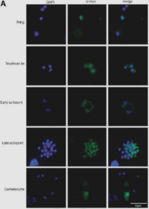 The RS domain localizes PfSR1 to the nucleus. IFAs showing the localization of PfSR1 wasectopically express fused to a myc epitope tag and detected using anti-myc antibodies. PfSR1 (green); DAPI staining (blue); developmental stages are indicated on the left. (A) Cellular localization of PfSR1-myc. PfSR1 shuttles between the nucleus and cytoplasm. The cytoplasmic location is restricted to regions that are outside the parasite’s food vacuole. the nuclear location of PfSR1 at early ring stages is in a distinct punctuated pattern mainly at the nuclear periphery and is not equally spread all over the nucleus.Eshar S, Allemand E, Sebag A, Glaser F, Muchardt C, Mandel-Gutfreund Y, Karni R, Dzikowski R. A novel Plasmodium falciparum SR protein is an alternative splicing factor required for the parasites' proliferation in human erythrocytes. Nucleic Acids Res. 2012 40(19):9903-16