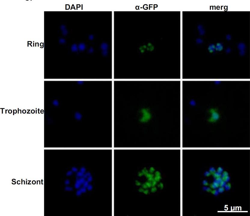 Induction of PfSR1 expression using the DDD system. Immuno-fluorescence assay (IFA) of PfSR1-GFP-DDD expressing parasites growing on 5 μM TMP showing the cellular localization of the induced PfSR1-GFP throughout the IDC. Tagged PfSR1 was detected using anti-GFP antibody. PfSR1 is shown in green; nuclei were stained with DAPI (blue). in early ring stages PfSR1-GFP-DDD localizes to the nucleus in foci that are mainly located at the nuclear periphery. This pattern changes later in the IDC at the trophozoite and schizont stages, when PfSR1-GFP-DDD can be detected in both the nucleus and in the cytoplasm .Eshar S, Altenhofen L, Rabner A, Ross P, Fastman Y, Mandel-Gutfreund Y, Karni R, Llinás M, Dzikowski R. PfSR1 controls alternative splicing and steady-state RNA levels in Plasmodium falciparum through preferential recognition of specific RNA motifs. Mol Microbiol. 2015 Jun;96(6):1283-97. a