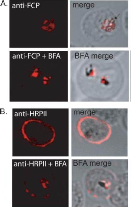 FCP localizes to the FV but does not traffic via the classical or alternate secretory pathways. A, immunofluorescence using anti-FCP revealed a discrete localization to the parasite FV. Ring stage parasites were treated either with 5 mg/ml BFA (anti-FCPP+BFA) or solvent as control (anti-FCP) for 12 h before immunofluorescence microscopy. BFA treatment did not alter FV localization of FCP. B, as a control experiment, parasites treated with BFA (anti-HRPIIBFA) or without BFA (anti-HRPII) were stained using antisera against a known secreted protein, HRPII. HRPII was localized predominantly to the cytoplasm of the host infected erythrocyte (anti-HRPII). BFA treatment resulted in a significant loss in erythrocyte localization of HRPII and a concomitant increase in the parasite cytoplasm (anti-HRPII + BFA).McIntosh MT, Vaid A, Hosgood HD, Vijay J, Bhattacharya A, Sahani MH, Baevova P, Joiner KA, Sharma P. Traffic to the malaria parasite food vacuole: a novel pathway involving a phosphatidylinositol 3-phosphate-binding protein. J Biol Chem. 2007 282:11499-508.