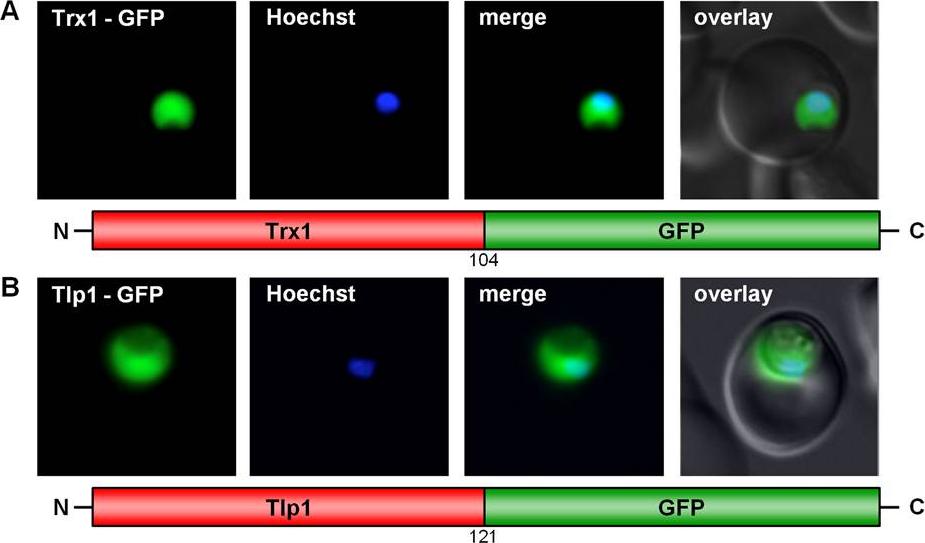 GFP targeting by P. falciparum thioredoxin 1 and thioredoxin-like protein 1. (A) Cytosolic localization of Trx1. (B) Cytosolic localization of Tlp1. Live cell imaging of erythrocytes infected with transgenic parasites for solely cytosolic GFP signals.Kehr S, Sturm N, Rahlfs S, Przyborski JM, Becker K. Compartmentation of redox metabolism in malaria parasites. PLoS Pathog. 2010 6:e1001242.