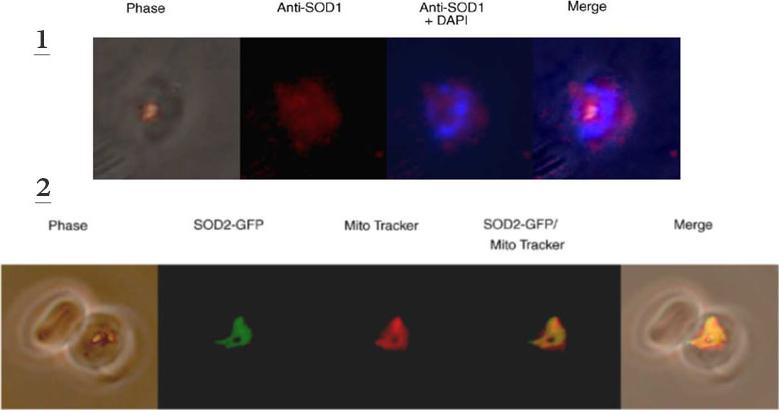 1. Anti-PfSOD1 antibodies were used at 1:250. PfSOD1 was visualised using a rhodamine-coupled secondary antibody at 1:300. Nucleic acids were stained with DAPI. PfSOD1 appears to be a cytosolic protein2. Parasites were transfected and analysed by fluorescence microscopy. The first 273 nucleotides of the PfSOD2 ORF result in targeting of GFP into the parasites’ mitochondrion as shown by co-localisation of GFP and Mitotracker CMX Ros. Sienkiewicz N, Daher W, Dive D, Wrenger C, Viscogliosi E, Wintjens R, Jouin H, Capron M, Müller S, Khalife J. Identification of a mitochondrial superoxide dismutase with an unusual targeting sequence in Plasmodium falciparum. Mol Biochem Parasitol. 2004 137:121-32. Copyright Elsevier 2009.