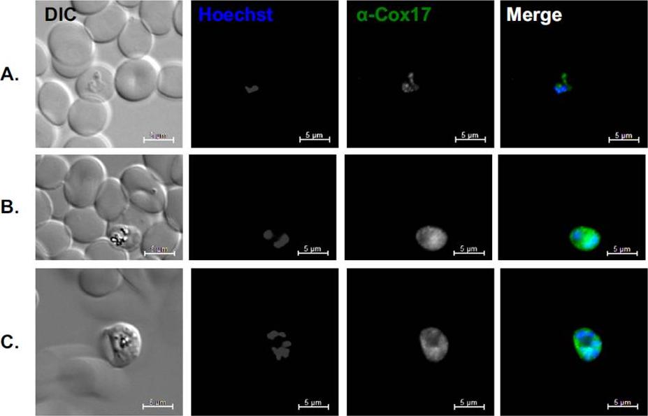 Immunolocalisation of P. falciparum Cox17 in asexual parasites grown in vitro. Cox17 was detected using chicken anti-peptide antibodies specific for PF3D7_1025600 and showed cytoplasmic localisation in ring (A), trophozoite (B) and schizont (C) stages of development. Chicken antibodies were detected with an anti-chicken antibody conjugated to Cy3. Parasite DNA was stained with Hoechst. Scale bar is 5 μm.Choveaux DL, Krause RG, Przyborski JM, Goldring JP. Identification and initial characterisation of a Plasmodium falciparum Cox17 copper metallochaperone. Exp Parasitol. 2014148C:30-39.