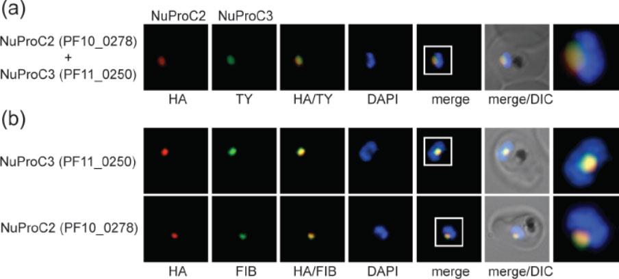 Identification of two novel P. falciparum nucleolar proteins. (a) IFA colocalisation of NuProC2-3xHA and NuProC3-2xTy in a double transgenic line. Epitope-tagged proteins were detected using anti-HA (red) and anti-Ty (green) antibodies. (b) NuProC2-3xHA and NuProC3-3xHA co-localize with nucleolar fibrillarin. HA-tagged proteins were detected in single transgenic lines using anti-HA antibodies (red). Fibrillarin (PfFIB) was visualized using an anti-human fibrillarin antibody.Oehring SC, Woodcroft BJ, Moes S, Wetzel J, Dietz O, Pulfer A, Dekiwadia C, Maeser P, Flueck C, Witmer K, Brancucci NM, Niederwieser I, Jenoe P, Ralph SA, Voss TS. Organellar proteomics reveals hundreds of novel nuclear proteins in the malaria parasite Plasmodium falciparum. Genome Biol. 2012 Nov 26;13(11):R108.