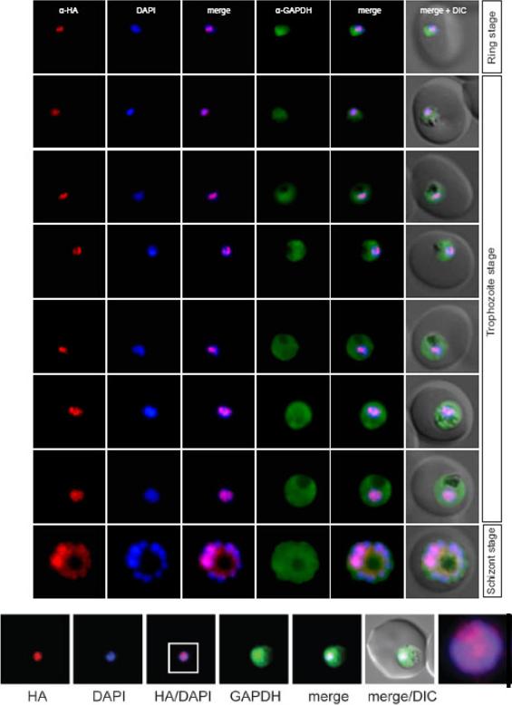 Localisation of PF10_0328 during the IDC. Localisation of the tagged protein was visualised using anti-HA antibodies (red). Antibodies against GAPDH were used to visualise the cytosolic compartment. DAPI was used to visualise the nucleus. DIC images are shown as reference. The protein localized to unknown nuclear subcompartment.Oehring SC, Woodcroft BJ, Moes S, Wetzel J, Dietz O, Pulfer A, Dekiwadia C, Maeser P, Flueck C, Witmer K, Brancucci NM, Niederwieser I, Jenoe P, Ralph SA, Voss TS. Organellar proteomics reveals hundreds of novel nuclear proteins in the malaria parasite Plasmodium falciparum. Genome Biol. 2012 Nov 26;13(11):R108.
