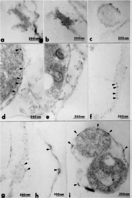 Immunoelectron micrography on streptolysin-O permeablised mature trophozoite (36 h after invasion of the merozoites) infected cells. FEST is associated with Golgi-like structures in the red cell cytoplasm (a and b); vesicles in the red cell cytoplasm (c); the parasite plasma membrane (d) and membranous structures in the red cell cytoplasm (e); knobs in the parasitised red cell plasma membrane (f–h). A cross-section through a parasitised red cell is shown in (i). FEST is associated with membranous structures in the red cell and with the red cell membrane, particularly at parasite-induced knobs.Kun JF, Hibbs AR, Saul A, McColl DJ, Coppel RL, Anders RF. A putative Plasmodium falciparum exported serine/threonine protein kinase. Mol Biochem Parasitol. 1997 85:41-51. Copyright Elsevier 2009.
