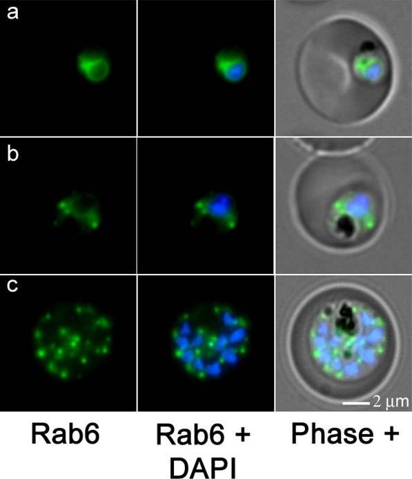 Dynamics of GFP–Rab6 expressing parasites during the asexual life cycle of P. falciparum. GFP fluorescence is focused in one defined area in close proximity to the nucleus with some additional ER staining and cytoplasmic background in ring stage parasites (a). Multiplication of the GFP–Rab6 compartment takes place prior to nuclear division (b). As the parasite matures, the GFP–Rab6 compartments further multiply (c). The transport of proteins from the endoplasmic reticulum (ER) to the cis-side of the Golgi complex takes place at specialized ER sub-domains known as transitional ER (tER). Golgi multiplication is closely linked to tER multiplication, and that parasite maturation is accompanied by the spatial separation of the cis- and trans- face of this organelle.Struck NS, Herrmann S, Schmuck-Barkmann I, de Souza Dias S, Haase S, Cabrera AL, Treeck M, Bruns C, Langer C, Cowman AF, Marti M, Spielmann T, Gilberger TW. Spatial dissection of the cis- and trans-Golgi compartments in the malaria parasite Plasmodium falciparum. Mol Microbiol. 2008 67:1320-30.