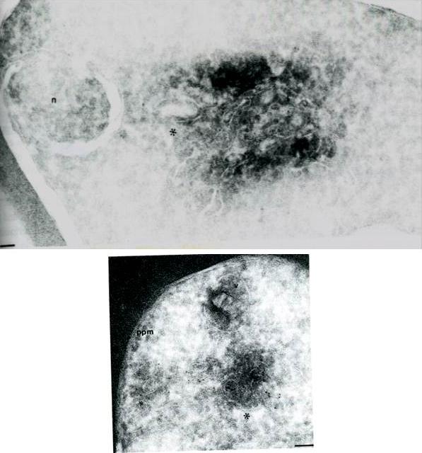 Cryosections of ring/trophozoite-infected Erythrocytes were probed with anti-Pf ERD2 (A) antibodies from non-immune sera (B) or anti-Pfrab6 (C) and goat anit-rabbit antibodies conjugated to 5 nm gold particles. In panel A, labeling of PfERD2 is detected in a perinuclear, tubulovesicular structure (*) with 1:100 anti PfERD2. The nucleus is marked by a n. Bar indicates 0.08 mm. In panel B, labeling of Pfrab6 (1:1OO) is seen in tubulovesicular clusters in peripheral regions of the cell. One cluster (large *) is proximal to the digestive food vacuole (marked with v). A second tubulovesicular cluster (small *) lies next to the parasite plasma membrane (marked by ppm). Bar indicates 0.1 mm. Van Wye J, Ghori N, Webster P, Mitschler RR, Elmendorf HG, Haldar K. Identification and localization of rab6, separation of rab6 from ERD2 and implications for an 'unstacked' Golgi, in Plasmodium falciparum. Mol Biochem Parasitol. 1996 83:107-20. Copyright Elsevier 2010