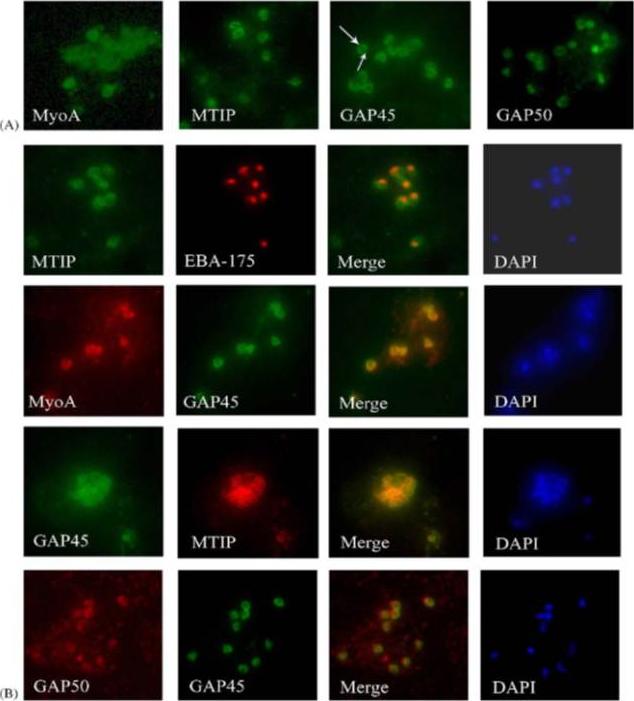 Characterization of PfGAP50 and PfGAP45 proteins. rabbit antiserum against recombinant PfGAP50 localizes to the merozoite periphery and remains following rupturing of schizont, consistent with localization to the IMC. The white arrows on putative invading merozoite point to interface with erythrocyte where increased fluorescence is detectable, possibly indicating concentration at the moving junction. Rabbit antiserum against recombinant PfGAP45 similarly suggests localization to the IMC. A second putative invading merozoite also suggests PfGAP45 is concentrated at the interface (white arrows) with the erythrocyte, consistent with the moving junction. Scale bar, 1 mm.Baum J, Richard D, Healer J, Rug M, Krnajski Z, Gilberger TW, Green JL, Holder AA, Cowman AF. A conserved molecular motor drives cell invasion and gliding motility across malaria life cycle stages and other apicomplexan parasites. J Biol Chem. 2006 281(8):5197-208.
