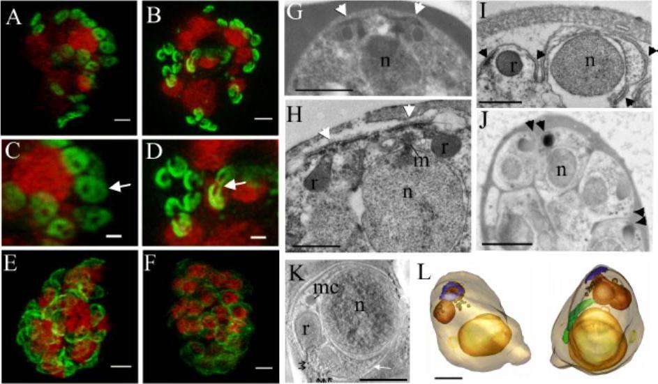 The IMC forms around the apical pore of developing merozoites. Structured illumination microscopy (3D-SIM) was performed on parasites expressing PfGAP50-GFP (green) labelled with DAPI nuclear stain (depicted in red). A,C. Schizont with eight nuclei, each with two associated PfGAP50-GFP-containing ellipsoids. Each ellipsoid has two unlabelled “pores” B,D. A schizont with eight nuclei that are undergoing division showing the PfGAP50-GFP-containing structures separating into claw-like structures. E,F. Mature schizonts in which the PfGAP50-GFP fluorescence is more evenly distributed around the periphery of the parasite. G,H. Transmission EM (TEM) images of early schizonts with electron-dense apical prominences with overlying membrane caps (arrowheads) forming in pairs on either side of a nucleus (n). The apical caps are connected to the underlying electron-dense rhoptries (r) and form close to a mitotic spindle (m). I. TEM image of a maturing schizont showing invagination of the parasite plasma membrane around the daughter cells and separation of the apical caps (arrowheads). J. TEM image of a mature schizont showing electron dense structures at the apical ends of closely apposed daughter cells (arrowheads). K. Selected virtual section (22 nm) through a tomogram showing a merozoite developing within a schizont. The electron dense polar rings are indicated with black arrows and the IMC with a white arrow. A microneme (mc) is visible. L,M. Rendered tomographic reconstructions of merozoites, generated from serial sections through the schizont shown in K, showing the nucleus in yellow, rhoptries in burnt orange, dense granules in brown, the polar rings in blue, the mitochondrion in green and a cytostomal ring as a yellow circle. Rotations of the 3D projection in A, B, E, and F are presented in Movies S1 – S4. Bars: A-F,G,J. = 1 μm, H,I,L,K = 500 nm.E, Maier AG, Klonis N, Maco B, Baum J, Turnbull L, Whitchurch CB, Dixonand MW, Tilley L. Tracking glideosome-associated protein-50 reveals the development and organization of the inner membrane complex of P. falciparum. Eukaryot Cell. 2011 10(4):556-64