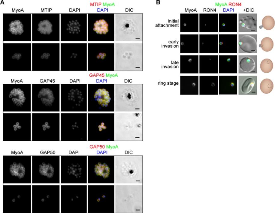 The location of MyoA during P. falciparum merozoite invasion. (A) MyoA-GFP is located at the periphery of developing intracellular (top row of each pair of images) and free extracellular merozoites (bottom row), and is colocalized with antibodies specific for IMC proteins MTIP, GAP45 and GAP50. In the merged colour image the MyoA-GFP signal is green and antibodies specific for the IMC proteins are red; nuclei are stained blue with DAPI. The DIC image is also shown. (B) Individual merozoites are captured at different stages of invasion from initial attachment, through early and late invasion to the intracellular ring stage. MyoA-GFP remains peripheral whereas RON4, initially in the apical rhoptry neck, relocates during invasion. Merged colour images with MyoA-GFP (green), RON4 (red), and nuclei (blue) and DIC images are also shown, together with a schematic of each cell-pair. Scale bar: 2 μm.Green JL, Wall RJ, Vahokoski J, Yusuf NA, Ridzuan MAM, Stanway RR, Stock J, Knuepfer E, Brady D, Martin SR, Howell SA, Pires IP, Moon RW, Molloy JE, Kursula I, Tewari R, Holder AA. Compositional and expression analyses of the glideosome during the Plasmodium life cycle reveal an additional myosin light chain required for maximum motility. J Biol Chem. 2017 Sep 11.