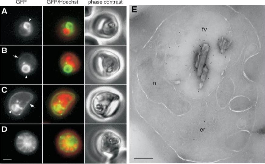 Localization of DPAP1 to the food vacuole and the parasitophorous vacuole. A–D, fluorescence microscopy of live parasites expressing DPAP1-GFP. A, trophozoite. B, ~2N schizont. C, ~8N schizont. D, 8N segmented schizont. In the center column fluorescence from GFP is green and that from nuclear stain Hoechst 33342 is red. The food vacuole is indicated with arrowheads in the GFP panels of A–C, and the parasitophorous vacuole is indicated with arrows in B and C. Fluorescent spots in B and C may be vesicular structures involved in transport of DPAP1-GFP to the food vacuole. Bar, 2 mm. E, immunogold labeling of an F9 parasite with anti-DPAP1 antibody. fv, food vacuole; er, endoplasmic reticulum; n, nucleus. Bar, 400 nm.Klemba M, Gluzman I, Goldberg DE. A Plasmodium falciparum dipeptidyl aminopeptidase I participates in vacuolar hemoglobin degradation. J Biol Chem. 2004 279:43000-7.