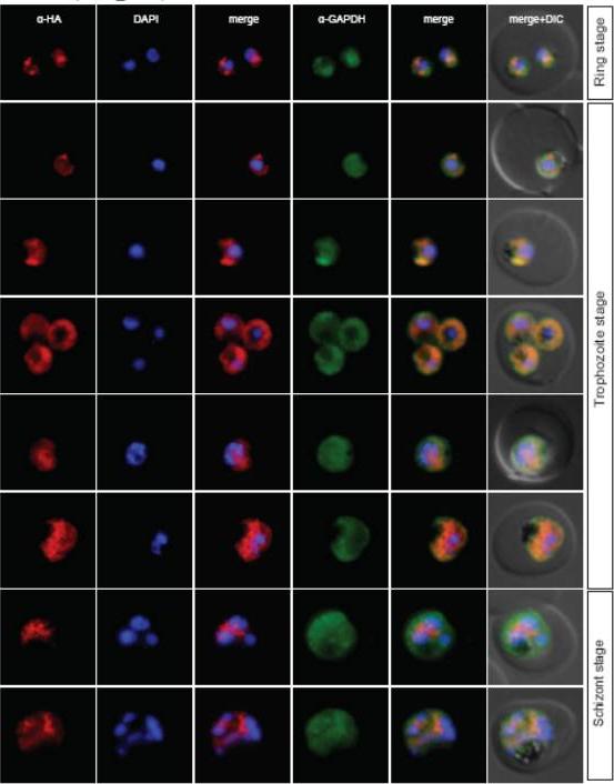 Localisation of PF11_0293 during the IDC. Localisation of the tagged protein was visualised using anti-HA antibodies (red). Antibodies against GAPDH were used to visualise the cytosolic compartment. DAPI was used to visualise the nucleus. DIC images are shown as reference. The protein is localized outside but in close proximity to the DAPI signal. These patterns were clearly distinct from the cytosolic GAPDH signal suggesting that it may be associated with the nuclear periphery. In addition, the protein appeared to accumulate in the cytosol in mature trophozoites.Oehring SC, Woodcroft BJ, Moes S, Wetzel J, Dietz O, Pulfer A, Dekiwadia C, Maeser P, Flueck C, Witmer K, Brancucci NM, Niederwieser I, Jenoe P, Ralph SA, Voss TS. Organellar proteomics reveals hundreds of novel nuclear proteins in the malaria parasite Plasmodium falciparum. Genome Biol. 2012 13(11):R108