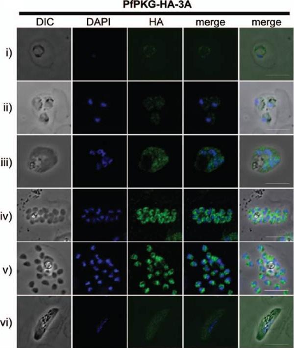 Immunofluorescent anti-HA detection in fixed smears of erythrocytic stages of the PfPKG-HA-3A clone. Representative images of (i) a ring stage parasite, (ii) three early trophozoites, (iii) an early schizont, (iv, v) late schizonts (approximate hours post invasion: (i) 4–10, (ii) 20–26, (iii) 33–39, (iv, v) 45–48) and (vi) a stage III gametocyte are shown together with bright field images (first column) and parasite nuclei stained with DAPI (second column). Bars ,5 mm. epitope-tagged PfPKG was detected most strongly in late blood stage parasites. A diffuse pattern of relatively low level PfPKG expression was detected in ring and early trophozoite stages and gametocytes. Very similar results were obtained using PfPKG-PTP-1A clones, as well as the parental 3D7 parasites in conjunction with the commercial human PKG-I antibody. PfPKG is primarily found in the cytosol.Hopp CS, Flueck C, Solyakov L, Tobin A, Baker DA. Spatiotemporal and Functional Characterisation of the Plasmodium falciparum cGMP-Dependent Protein Kinase. PLoS One. 2012;7(11):e48206.