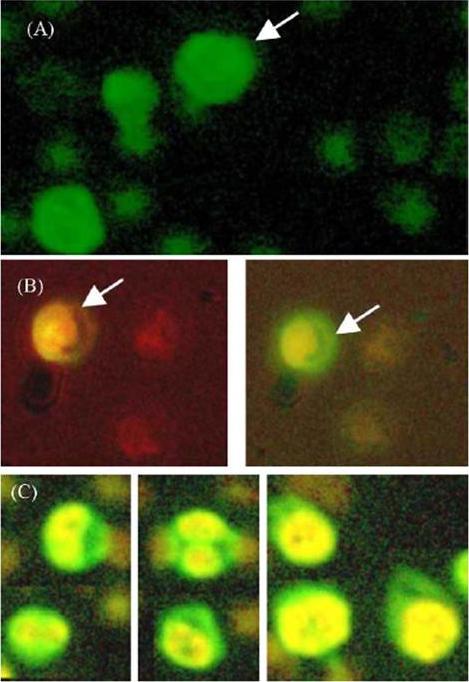 Confocal microscopy of parasitized erythrocytes detected using primary antibody generated with the recombinant pf CTP synthetase, and visualised with a secondary antibody labeled with FITC. (A) Parasite infected erythrocytes (indicated by an arrow) have a much brighter fluorescence compared to non-infected erythrocyte cells, which appear with a low level green auto-fluorescence. (B) Overlaid images from red and green wavelength of parasitized and non-parasitized erythrocytes. The arrows indicate the locations of pfCTP synthetase. (C) Parasitized erythrocytes at different stages of the parasite life cycle: ring stage, trophozoite stage and schizont stage (left to right).Yuan P, Hendriks EF, Fernandez HR, O'Sullivan WJ, Stewart TS. Functional expression of the gene encoding cytidine triphosphate synthetase from Plasmodium falciparum which contains two novel sequences that are potential antimalarial targets. Mol Biochem Parasitol. 2005 143(2):200-8. PMID: