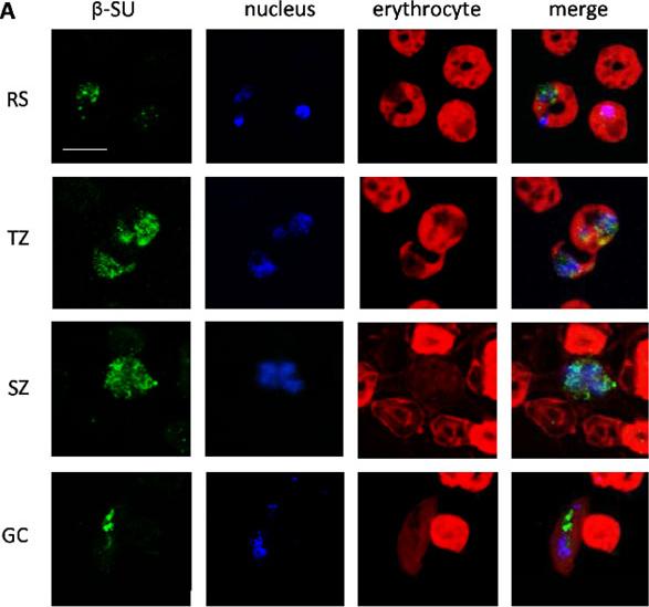 Subcellular localization of β-SU type 5 in the P. falciparum blood stages. (A) Indirect immunofluorescence assays using mouse polyclonal antisera against β-SU type 5 revealed localization of the protein in the ring, trophozoite, schizont or gametocyte stages (green, AlexaFluor 488). Nuclei were highlighted by Hoechst nuclear staining (blue), erythrocytes were counterstained by Evans Blue (red). Bar, 5 μm. RS, ring stage; SZ, schizont; TZ, trophozoite. While there was minor punctuate labelling detected in the ring stages (RS), β-SU type 5 was abundantly expressed in trophozoites and schizonts, where it was present in the cytoplasm and associated with the parasite nucleus (TZ and SZ). In gametocytes, β-SU type 5 was primarily localized to the cytoplasm (GC).Aminake MN, Schoof S, Sologub L, Leubner M, Kirschner M, Arndt HD, Pradel G. Thiostrepton derivatives exhibit antimalarial and gametocytocidal activity by dually targeting parasite proteasome and apicoplast. Antimicrob Agents Chemother. 2011 55(4):1338-48