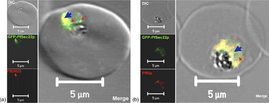 Subcellular localization of GFP-PfSec22p. GFP-expressing parasites were fixed and stained with anti-PfERD2 or anti-PfBip antibodies. Blue arrowheads indicate co-localization sites between the fusion protein GFP-PfSec22p (green) and the cis-Golgi marker PfERD2 (red, panel a) or the ER marker PfBip (red, panel b). The inserted red arrows show GFP fluorescence in locations different from cis-Golgi or ER compartments.Ayong L, Pagnotti G, Tobon AB, Chakrabarti D. Identification of Plasmodium falciparum family of SNAREs. Mol Biochem Parasitol. 2007 152:113-22. Copyright Elsevier 2009.