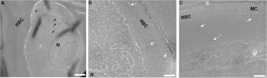 Immunoelectron micrographs depicting the association of GFP-PfSec22 with transition vesicles and tubovesicular elements. Ultrathin cryosections of the GFP-PfSec22 expressing cells were probed with monoclonal anti-GFP antibodies followed by immunogold detection using gold (12nm)-labeled anti-mouse secondary antibodies. (A) Association of GFP-PfSec22 with ER-derived transition vesicles (black arrowhead). (B) Association of GFP-PfSec22 with membrane-limited vesicles (white arrowheads) in the host cell compartment. (C) Association of GFP-PfSec22 with the TVN-like extension (dotted arrow) and membrane-bound vesicles (white arrowhead) in the infected 7 erythrocyte cytosol. N: nucleus, MC: Maurer’s cleft, RBC: red blood cell cytosol. Scale bars are 8 500 nm in (A), and 100 nm in (B) and (C).Ayong L, Raghavan A, Schneider TG, Taraschi TF, Fidock DA, Chakrabarti D. The Longin domain regulates the steady-state dynamics of Sec22 in P. falciparum. Eukaryot Cell. 2009 8(9):1330-40