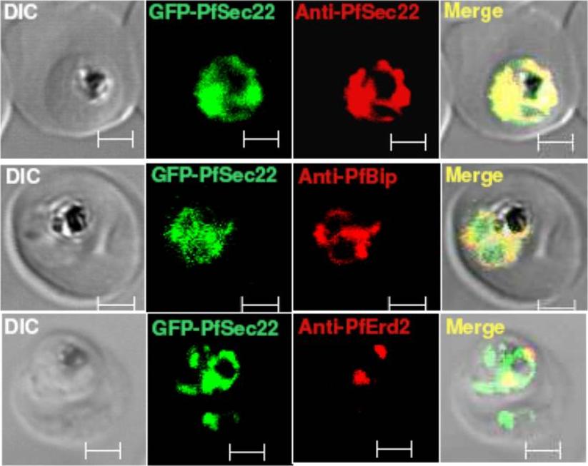 Live-cell imaging of GFP-tagged PfSec22 chimeras. (B) Live-cell imaging of parasites expressing the C-terminal GFP-tagged PfSec22 (PfSec22-GFP) showing diffuse localization of the protein throughout the parasite cytoplasm and occasionally in the host cell compartment. (C) Confocal micrographs showing localization of the N-terminal GFP-tagged protein (GFP-PfSec22) in earlytrophozoite (top row) and mid-trophozoite (bottom row) stage parasites. In addition to the ER-like profiles, GFP-PfSec22 associates with tubovesicular elements in the infected host cell. The micrographs (left to right) represent differential interference contrast, GFP fluorescence, and a merge of the two. Scale bars, 2 mm. Ayong L, Raghavan A, Schneider TG, Taraschi TF, Fidock DA, Chakrabarti D. The Longin domain regulates the steady-state dynamics of Sec22 in P. falciparum. Eukaryot Cell. 2009 8(9):1330-40.