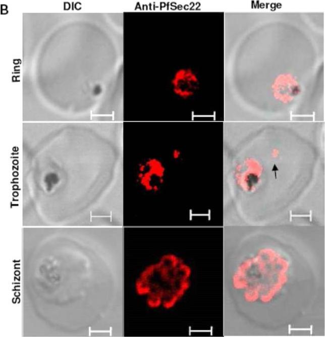 Immunofluorescence microscopy of fixed cells using anti-PfSec22 antibodies and goat anti-rabbit Alexa Fluor 555 secondary antibodies. An intense ring of PfSec22 fluorescence is visible in ring- and trophozoite-infected cells. Isolated foci of PfSec22 fluorescence (arrow) are also detected in the host cell compartment in trophozoite-infected cells, suggesting export of PfSec22 into the erythrocyte cytosol. Scale bars, 2 mm.Bottom row: Coimmunolocalization and membrane association of endogenous PfSec22. The association of PfSec22 with the parasite ER was investigated by coimmuno-fluorescence assays using rabbit anti-PfSec22 and rat anti-PfBip antibodies, as indicated. Both proteins colocalized significantly within the parasite. Scale bars, 2 mm.Ayong L, Raghavan A, Schneider TG, Taraschi TF, Fidock DA, Chakrabarti D. The Longin domain regulates the steady-state dynamics of Sec22 in P. falciparum. Eukaryot Cell. 2009 8(9):1330-40.
