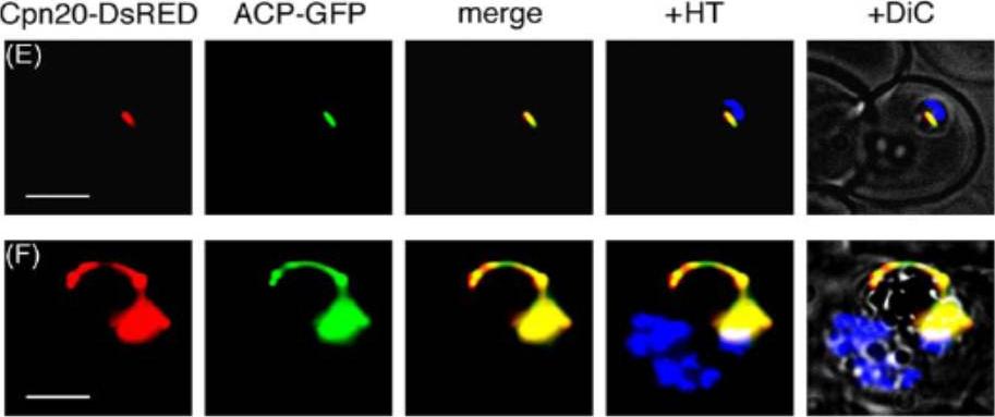 Plastid localization of pSSPF2/Pf Cpn20-DsRED and pSSPF2/PfACP-GFP in a double-transfectant in the ring stage (E) or in the schizont stage (F). Fluorescent proteins (DsRED, red; GFP, green) or MitoTracker Green FM (MTG, green) were monitored by fluorescence microscopy using a DeltaVision microscope system (Applied Precision). +HT, merge with the blue signal of Hoechst 33342 indicating the position of the nucleus of each parasite. +DiC, overlay on the differential phase contrast image. Scale bar: 5 mm. Sato S, Wilson RJ. Organelle-specific cochaperonins in apicomplexan parasites. Mol Biochem Parasitol. 2005 141:133-143. Copyright Elsevier 2009.