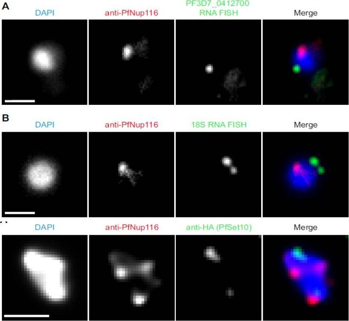 Upper 2 panels: Colocalization of gene expression sites with nuclear pores. (A) Combination of anti-PfNup116 immuno-fluorescence staining with RNA-FISH using a probe against the active var gene expressed in 3D7-G7 clone (PF3D7_0412700). Nucleus stained by DAPI. Bar, 1 μm.(B) As in (A) with FISH probe against 18S ribosomal RNA. (C) Fraction of cells with an overlap of FISH and nuclear pore foci. Lower panel: Colocalization of PfSet10-HA with nuclear pores. Combination of anti-PfNup116 and anti-HA immunofluorescence staining on early trophozoite stage parasite expressing recombinant PfSet10-HA. Nucleus stained by DAPI. Bar, 1 μm.Guizetti J, Martins RM, Guadagnini S, Claes A, Scherf A. Nuclear pores and perinuclear expression sites of var and rDNA genes correspond to physically distinct regions in Plasmodium falciparum. Eukaryot Cell. 2013 12(5):697-702