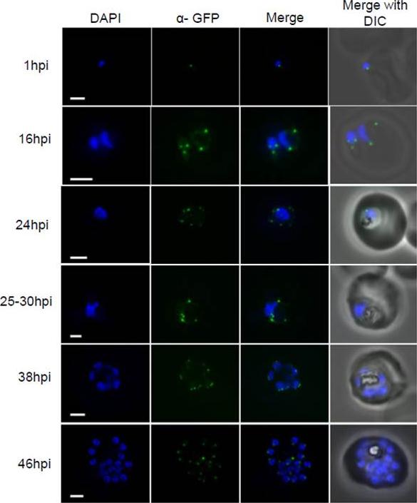 Dynamics of PfSec13-GFP during P. falciparum intra erythrocytic development. Conventional fluorescent imaging of PfSec13-GFP (Green) at different time points (hpi = hours post invasion) during the IDC. Strong signals of PfSec13-GFP at the periphery of the DAPI stained nucleus corresponds with NPC clusters. Dynamics in cluster number and orientation were documented from 1 hpi to 46 hpi. At the late schizont stage (from 38 hpi to 46 hpi) there is a change in NPC orientation. The size bar represents 1μm. The size bar represents 2 μm for 1, 16, 24, 38 & 48 hpi and 1 μm for 30 hpi. Strong signals are seen at the nuclear periphery and faint background in the cytoplasm. Dahan-Pasternak N, Nasereddin A, Kolevzon N, Pe'er M, Wong W, Shinder V, Turnbull L, Whitchurch CB, Elbaum M, Gilberger TW, Yavin E, Baum J, Dzikowski R. PfSec13 is an unusual chromatin associated nucleoporin of Plasmodium falciparum, which is essential for parasite proliferation in human erythrocytes. J Cell Sci. 2013 126(Pt 14):3055-69 Reproduced with permission.