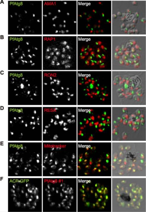 PfAtg8 localizes to the apicoplast. P. falciparum FCR3 (A–E) and P. falciparum 3D7 transfected with ACP-GFP (F–H) were stained with the indicated organelle markers and visualized by confocal microscopy (because ACP-GFP was not uniformly expressed, some merozoites displayed only faint GFP signals). Anti-PfAtg8 antibody #1 was used in (A–F), and anti-PfAtg8 antibody #2 was used in (G). Apical membrane antigen 1 (AMA1) as a microneme marker (A), rhoptry-associated protein 1 (RAP1) as a rhoptry body marker (B), rhoptry neck protein 2 (RON2) as a rhoptry neck marker (C), the ring-infected erythrocyte surface antigen (RESA) as a dense granule marker (D), MitoTrackerRed CMXRos as a mitochondria marker (E), ACPGFP (F–H) and the organellar histone-like protein PfHU (H) as an apicoplast marker were used. Scale bar, 1 mm.Kitamura K, Kishi-Itakura C, Tsuboi T, Sato S, Kita K, Ohta N, Mizushima N. Autophagy-Related Atg8 Localizes to the Apicoplast of the Human Malaria Parasite Plasmodium falciparum. PLoS One. 2012;7(8):e42977.