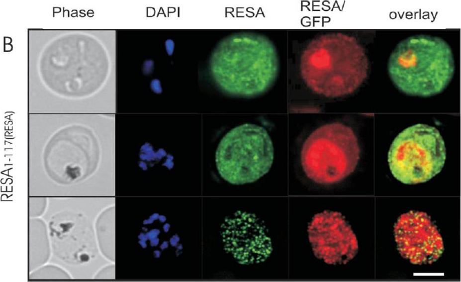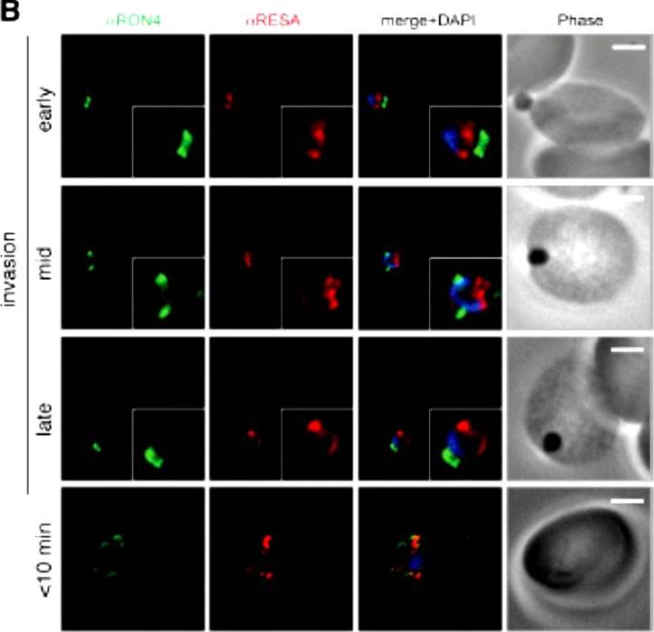 Wide field IFA time course of invasion using anti-RESA/PfRON4. Scale bar = 2.0 μm. Pre-egress shows standard wide-field image. Invasion images show IFA with deconvolution (single slice). RESA is retained within the merozoite body, often at the apical end but frequently basal to rhoptries and micronemes (RESA early). RESA, in contrast, retained its position inside the merozoite, establishing that release of dense granule proteins likely occurs postinvasion (RESA mid). RESA, localization became markedly more peripheral and evenly distributed around the merozoite immediately after invasion (RESA late), supporting the notion that dense granules are released after invasion at the merozoite plasma membrane.Riglar DT, Richard D, Wilson DW, Boyle MJ, Dekiwadia C, Turnbull L, Angrisano F, Marapana DS, Rogers KL, Whitchurch CB, Beeson JG, Cowman AF, Ralph SA, Baum J. Super-resolution dissection of coordinated events during malaria parasite invasion of the human erythrocyte. Cell Host Microbe. 2011 9:9-20.