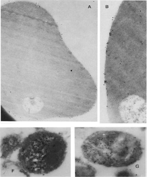 Immunoelectron micrographs showing sections of ring-infected erythrocytes reacted first with rabbit anti-RESA (A) or ~2 mg/ml of affinity-purified human anti-RESA antibodies (B), then with protein A gold; other sections of merozoites were reacted with rabbit anti-RESA (C-F) or 0.5 mg/ml human anti-RESA antibodies (C), and then protein A gold. (A) X 35,600; (B) X 56,500; (F) X 59,200; (G) X 57,500).Brown GV, Culvenor JG, Crewther PE, Bianco AE, Coppel RL, Saint RB, Stahl HD, Kemp DJ, Anders RF. Localization of the ring-infected erythrocyte surface antigen (RESA) of Plasmodium falciparum in merozoites and ring-infected erythrocytes. J Exp Med. 1985 162:774-9.