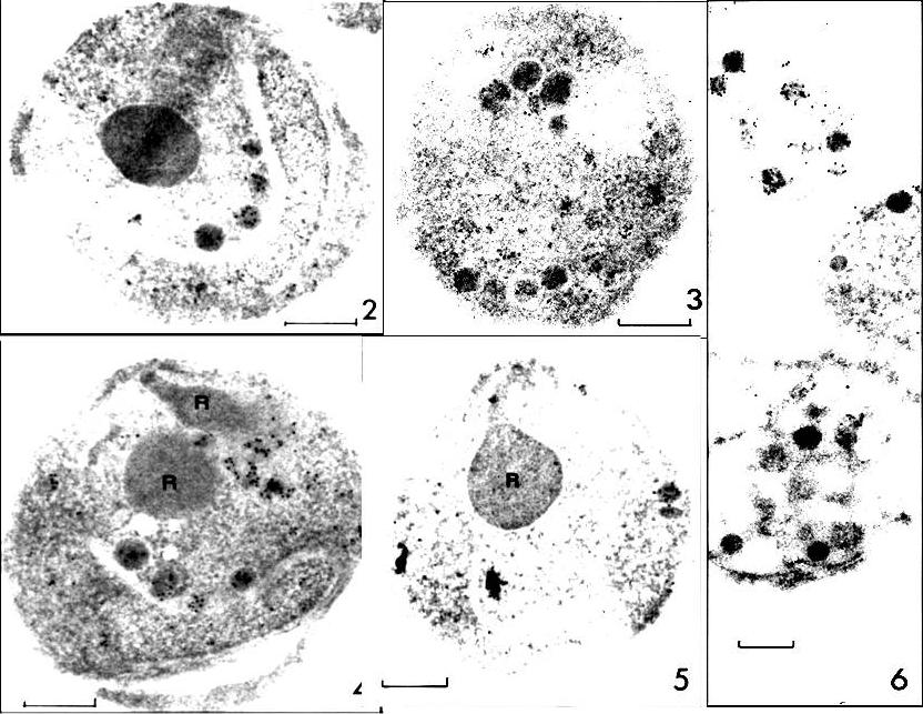 RESA labeling of P. falciparum merozoite dense granules (protein A-5-nm gold; bars, 0.2 ,mm). FIG. 2 and 3. Sections of D10 merozoites with labeled dense granules after incubation with MAb23/9. FIG. 4 and 5. Sections of D10 merozoites with rhoptries (R) in view after incubation with human anti-RESA, preparation H145. FIG. 6. Disrupted D10 merozoites with labeled dense granules (MAb23/9). ports. The studies described here show that P. falciparum RESA is localized to dense round granules (of up to 100 nm in diameter) in merozoites and to similar-sized aggregates of amorphous material in the parasitophorous vacuole of newly invaded erythrocytes.Culvenor JG, Day KP, Anders RF. Plasmodium falciparum ring-infected erythrocyte surface antigen is released from merozoite dense granules after erythrocyte invasion. Infect Immun. 1991 59:1183-1187.