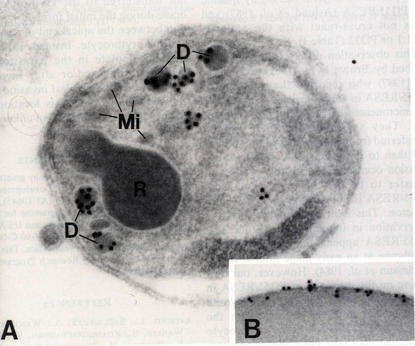 A) Free merozoite. Gold particles which identify the presence of Pf155/RESA are only associated with dense granules (D). Label is not present on rhoptries (R) or micronemes (Mi). X67,000. B) Immunoelectron micrograph showing gold particles on the ring infected erythrocyte. This localization is characteristic of Pf155/RESA> x48,000.Aikawa M, Torii M, Sjölander A, Berzins K, Perlmann P, Miller LH. Pf155/RESA antigen is localized in dense granules of Plasmodium falciparum merozoites. Exp Parasitol. 1990 71:326-9. Copyright Elsevier 2010.