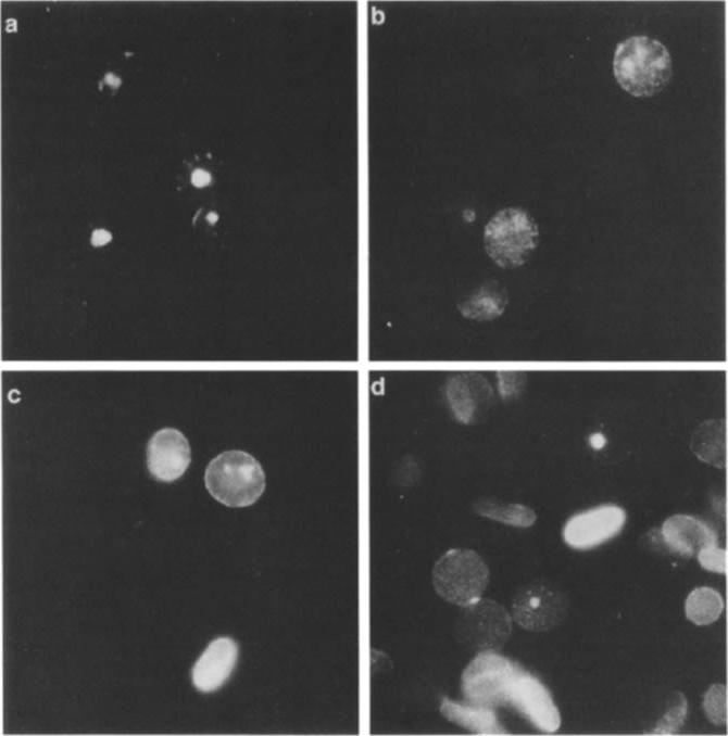 Indirect immunofluorescence using P. falciparum-infected erythrocytes glutaraldehyde fixed in suspension only (a) or subsequently treated with 0.1% saponin (b) or 10% Triton X-100 (c, d). It was previously shown that Pfl55/RESA is not accessible for reaction with antibodies on the surface of intact P. falciparum-infected erythrocytes unless the membrane is modified, e.g., by glutaraldehyde fixation and air dryingProbing was done with the human MAb 3362 (a-c) or the mouse Mab 4C8F6 directed against a cytoplasmic epitope of band 3 (d). The samples were counterstained with ethidium bromide to visualize the intracellular parasites.Ruangjirachuporn W, Udomsangpetch R, Carlsson J, Drenckhahn D, Perlmann P, Berzins K. Plasmodium falciparum: analysis of the interaction of antigen Pf155/RESA with the erythrocyte membrane. Exp Parasitol. 1991 73:62-72. Copyright Elsevier 2010.
