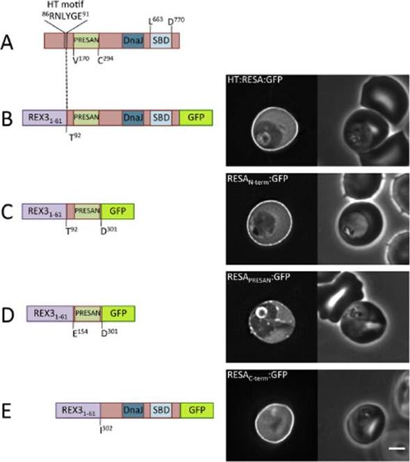 A. Domain architecture of PF3D7 0102200 (RESA), not to scale. PRESAN, domain boundaries defined according to Pfam ID: PF09687; DnaJ domain as defined byPfam ID: PF14308; SBD, spectrin-binding domain. (B–E) Domain architecture and localisation of HT:RESA:GFP reporter constructs. REX31–61, N-terminal sequence of REX3,including its HT motif, which is sufficient to drive protein export. Residue numbers, below each diagram, refer to position within full-length RESA. The left- and right-hand images show GFP localisation and a phase contrast image, respectively. Scale bar, 2 mm. The identity of each parasite line is indicated above the respective images. the extended PRESAN domain of RESA, a known cytoskeleton-associated protein, efficiently targets to the erythrocyte periphery.Tarr SJ, Moon RW, Hardege I, Osborne AR. A conserved domain targets exported PHISTb family proteins to the periphery of Plasmodium infected erythrocytes. Mol Biochem Parasitol. 2014 196(1):29-40