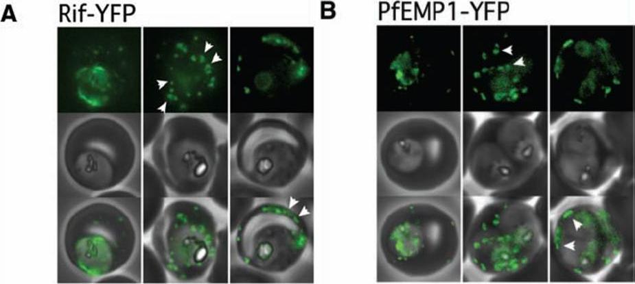 Export of Rifin surface antigens and of the major P. falciparum virulence factor, PfEMP1, depends on a functional Pexel motif. (A) A Rifin-YFP fusion including the Pexel motif is exported into the erythrocyte. Arrowheads indicate the localization of the reporter to punctate structures reminiscent of Maurer’s clefts (left panel, center) and later to the surface. (B) Export of PfEMP1-YFP also depends on a functional Pexel motif. As for the Rifin-YFP fusion, the reporter transiently localizes to structures similar to Maurer’s clefts, followed by a rim fluorescence suggestive of surface localization. Representative cells expressing the exported reporter are shown in ring stage (left), early (center), and late trophozoites (right). Marti M, Good RT, Rug M, Knuepfer E, Cowman AF. Targeting malaria virulence and remodeling proteins to the host erythrocyte. Science. 2004 306(5703):1930-3. Copyright 2010.