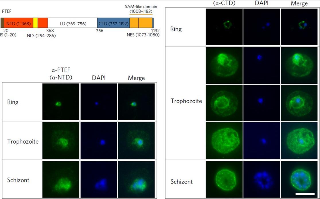 PTEF localizes to multiple cellular compartments. Immunofluorescence assay (IFA) using anti-NTD serum (left) and anti-CTD IgG (right). DAPI was used to stain parasite DNA. Images are representative of five IFA replicates. Scale bars, 5 μm. During ring stages, CTD staining was localized to the cytoplasm of the parasite, whereas late-stage parasites displayed strong fluorescence signals that covered both the parasitic and erythrocytic compartmentsin most IEs, resembling the pattern of full-length GFP fusion transfectants in the live imaging. However, heterogeneous staining was observed for some late-stage IEs, with some showing predominant localization within the parasite compartment, whereas others exhibited preferential staining at the PV/PPM. Despite the lack of a PEXEL motif, the export of the PTEF protein was also observed when using antibodies against the NTD, although a lower erythrocytic-to-parasitic signal ratiowas observed.Chan S, Frasch A, Mandava CS, Ch'ng JH, Quintana MDP, Vesterlund M, Ghorbal M, Joannin N, Franzén O, Lopez-Rubio JJ, Barbieri S, Lanzavecchia A, Sanyal S, Wahlgren M. Regulation of PfEMP1-VAR2CSA translation by a Plasmodium translation-enhancing factor. Nat Microbiol. 2017 May 8;2:17068.