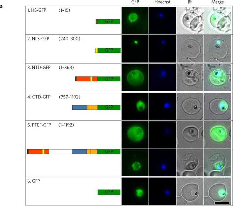 PTEF localizes to multiple cellular compartments. a, Direct live imaging on parasites transfected with GFP genes fused with HS (1), NLS (2), NTD (3), CTD (4), full-length PTEF (5) and GFP alone (6). HS-GFP displayed exclusive localization to the parasitophorous vacuole (PV)/parasite plasma membrane (PPM), whereas the NLS-GFP construct faithfully imported GFP into the nucleus. Interestingly, the NLS signal was overridden when present in the whole NTD, resulting in diffuse localization of the NTD-GFP to the PV/PPM as well asto the erythrocyte cytoplasm and membrane. By contrast, CTD-GFP was only found to localize in the parasite cytoplasm. Again, the full-length PTEF-GFP displayed a diffuse pattern in the entire parasite and host erythrocytes, with a small fraction of IEs showing intense localization to the PV/PPM.Chan S, Frasch A, Mandava CS, Ch'ng JH, Quintana MDP, Vesterlund M, Ghorbal M, Joannin N, Franzén O, Lopez-Rubio JJ, Barbieri S, Lanzavecchia A, Sanyal S, Wahlgren M. Regulation of PfEMP1-VAR2CSA translation by a Plasmodium translation-enhancing factor. Nat Microbiol. 2017 May 8;2:17068.