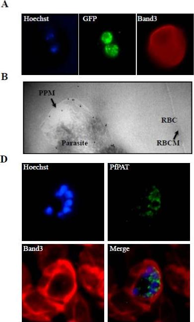 PfPAT localization in P. falciparum-infected erythrocytes. (A) localization of PfPAT-GFP by imunofluorescence analysis using anti-GFP (green). The red blood cell membrane marker Band3 (red) was detected using an anti-Band3 monoclonal antibody. Parasite nucleus was visualized using the Hoescht 33258 dye (blue). PfPAT signal is seen both on the parasite plasma membrane as well as associated with vesicular structures extending from the nuclear membrane in all blood stages – probably due to over expression. (B) Transmission electron micrograph of ultrathin cryosections of the intraerythrocytic early trophozoite stage of P. falciparum PfPAT-GFP transgenic parasites using anti-GFP antibody (18-nm gold particles; indicated with arrowheads). PPM: parasite plasma membrane. RBC: red blood cell. RBCM: red blood cell membrane. Most PfPAT signal (~68% of gold particles) is found to be associated with the parasite plasma membrane. (D) Localization of PfPAT in P. falciparum 3D7 parasites at the schizont stage using anti-PfPAT antibodies (green). The red blood cell membrane marker Band3 (red) was detected using an anti-Band3 monoclonal antibody. Parasite nucleus was visualized using the Hoescht 33258 dye (blue). Localization of the protein to the plasma membrane of the parasite is seen at all stages of the parasite intraerythrocytic life cycle. This localization is particularly noticeable in parasites at the schizont stage with fluorescence signal surrounding each individual merozoite.Augagneur Y, Jaubert L, Schiovani M, Pachikara N, Garg A, Usmani-Brown S, Wesolowski D, Zeller S, Ghosal A, Cornillot E, Said HM, Kumar P, Altman S, Ben Mamoun C. Identification and Functional Analysis of the Primary Pantothenate Transporter, PfPAT, of the Human Malaria Parasite Plasmodium falciparum. J Biol Chem. 2013 288(28):20558-67.