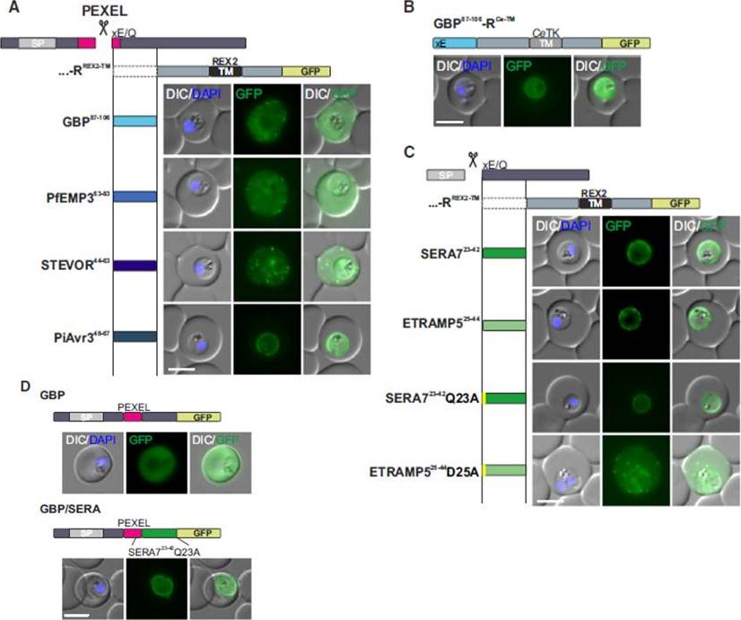Mature PEXEL N Termini Promote Export of RREX2-TM (A–C) Images of live P. falciparum parasites expressing RREX2-TM fused with the mature N termini of PEXEL proteins (A), GBP87–106-RCe-TM (B), or RREX2-TM fused with the mature N termini of nonexported secretory proteins (C). The position of the appended region in the original protein is shown above each panel.(D) Images of live P. falciparum parasites expressing truncated GBP fused to GFP (GBP, top) or GBP-GFP with the mature N terminus of SERA7Q23A after the PEXEL (GBP/SERA, bottom). Although these N termini contain only the last of the conserved PEXEL residues (PEXEL position 5) and the nonconserved position 4, they promoted export of the reporter into the host cell (A). GFP fluorescence was detected in the erythrocyte cytosol and the Maurer’s clefts.Grüring C, Heiber A, Kruse F, Flemming S, Franci G, Colombo SF, Fasana E,Schoeler H, Borgese N, Stunnenberg HG, Przyborski JM, Gilberger TW, Spielmann T. Uncovering common principles in protein export of malaria parasites. Cell Host Microbe. 2012 12(5):717-29.