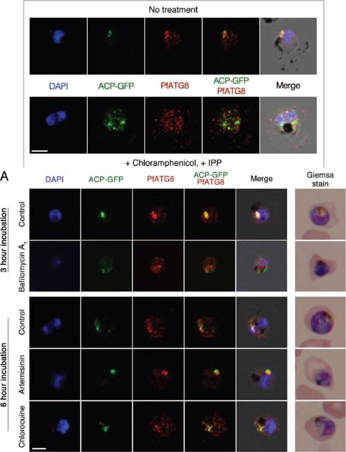 PfATG8 immunofluorescent staining in apicoplast-minus malaria parasites. The integrity of the apicoplast in these parasites was lost using treatment with the antibiotic chloramphenicol. GFP-ACP parasite cultures were rescued by supple-menting media with isopentenyl pyrophosphate (IPP), the essential product from the non-mevalonate isoprenoid precursor pathway in the apicoplast. The large apicoplast PfATG8-labeled branching, as observed in untreated parasites, is disrupted into multiple foci in apicoplast-minus parasites. These foci show colocalization of GFP-ACP and PfATG8 vesicles, although additional PfATG8 vesicles can be observed in the cytosol. DAPI is used as a DNA marker in blue. Scale bar: 2.5 μmA.PfATG8 immunofluorescent staining in 3D7 parasites treated with lysosomotropic agents and artemisinin. After 3 h incubation with 75 nM of bafilomycin A1, branching of the apicoplast is disrupted and multiple PfATG8 autophagosomes can be observed. Artemisinin treatment at a high concentration (25 μM) results in cell cycle progression arrest, and chloroquine treatment, at a concentration of 100 nM (IC80), causes disruption of the apicoplast integrity. DAPI is used as a DNA marker in blue. Scale bar: 2.5 μm.Cervantes S, Bunnik EM, Saraf A, Conner CM, Escalante A, Sardiu ME, Ponts N, Prudhomme J, Florens L, Le Roch KG. The multifunctional autophagy pathway in the human malaria parasite, Plasmodium falciparum.. Autophagy. 2013 Nov 11;10(1).