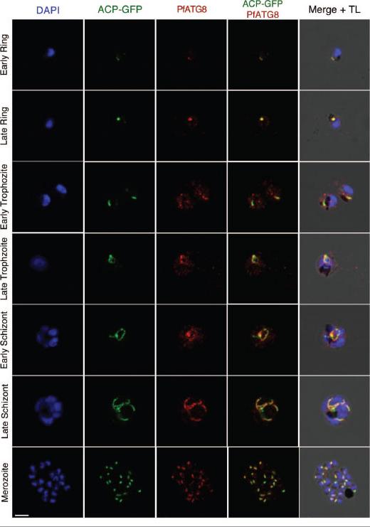 PfATG8 immunofluorescence staining throughout the erythrocytic cycle. Tightly synchronized P. falciparum D10-ACP-GFP parasites were immunolabeled with anti-PfATG8. D10 parasites express ACP-GFP, an apicoplast signal and transit peptide fused to GFP that localizes to the apicoplast. Localization of ACP-GFP and PfATG8 can be observed, although PfATG8 appears to surround the apicoplast, indicating a possible association with the outer membrane. Additional PfATG8 vesicles can be observed in the cytosol and host red blood cell from the late ring to late trophozoite stage, when parasites are metabolically active. DAPI is used as a DNA marker in blue. Scale bar: 5 μm.Cervantes S, Bunnik EM, Saraf A, Conner CM, Escalante A, Sardiu ME, Ponts N,Prudhomme J, Florens L, Le Roch KG. The multifunctional autophagy pathway in the human malaria parasite, Plasmodium falciparum.. Autophagy. 2013 Nov 11;10(1).