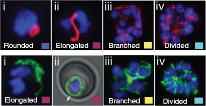 Top - Apicoplast and mitochondrial morphology and association during schizogony in P. falciparum. Live citrate synthase-YFP and acyl carrier proten DsRed double transfectant cells were co-labelled with the nuclear dye Hoechst 33258. Apicoplast morphology was categorized into four sorts: (i) rounded (ii) elongated (iii) branched and (iv) divided. Results indicated that at the onset of schizogony, the apicoplast is predominantly elongated in form. By the 6–10 nucleus stage, branched apicoplasts are the predominant form, with the majority of apicoplasts divided by the >15 nucleus stage. Bottom - Mitochondrial morphology was categorized as (i and ii) elongated (iii) branched and (iv) divided. The mitochondrion is a dynamic organelle, whose predominant form throughout the asexual cycle was branched. Mitochondrial division occurs very late in schizogony. The mitochondrion appears capable of fusion (ii and iii) and frequently associates with the plasma membrane (ii, arrow).van Dooren GG, Marti M, Tonkin CJ, Stimmler LM, Cowman AF, McFadden GI. Development of the endoplasmic reticulum, mitochondrion and apicoplast during the asexual life cycle of Plasmodium falciparum. Mol Microbiol. 2005 57:405-19.